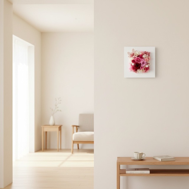立てかけ・壁掛けの2通りで飾っていただけるフレームアレンジメントです。 プリザーブドフラワーのバラをふんだんに使用し、やさしく華やかな印象に仕上げました。 ホワイトフレームが空間になじみ、棚や壁に自然に溶け込みます。 大切な方への贈り物としてはもちろん、ご自宅のインテリアとしてもおすすめです。 ※注意※ ・他サイトでも販売しているため、タイミングにより完売となる場合がございます。恐れ入りますが、ご入金確認順での確保となります。 ・直射日光が当たらない場所、高温多湿な場所を避けて使用・保管してください。変形・変色の原因になります。 ・ラッピングの仕様は予告なく変更となる場合があります。 ・プレゼント用の直接発送も承っています。納品書など金額が分かる物は同封いたしませんのでご安心ください。 7150円 ・▢約18cm×奥行き 約4.5cm ・素材:MDF ・クリアケース:▢約19cm×奥行 約11.5cm ・使用花材:バラ、あじさい、ニゲラ等
