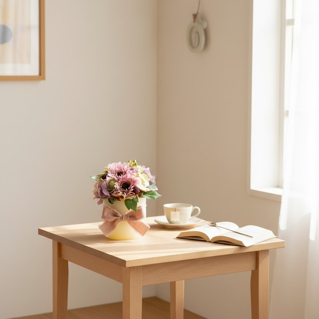 スモーキーなピンク系のプリザーブドフラワーを使用した、上品でかわいらしい置き型アレンジメントです。 メインに使用しているバラは『愛情』『感謝』『美しさ』などの花言葉を持ち、特別な想いを添える贈り物としてもおすすめです。 プリザーブドフラワーは生花の風合いをそのまま残しながらも、お手入れ不要で長期間色褪せずお楽しみいただけます。 棚やデスク、玄関などに置くだけで空間を華やかに彩ります。 ※注意※ ・他サイトでも販売しているため、タイミングにより完売となる場合がございます。恐れ入りますが、ご入金確認順での確保となります。 ・直射日光が当たらない場所、高温多湿な場所を避けて使用・保管してください。変形・変色の原因になります。 ・ラッピングの仕様は予告なく変更となる場合があります。 ・プレゼント用の直接発送も承っています。納品書など金額が分かる物は同封いたしませんのでご安心ください。 4950円 ・高さ 約15.5cm×幅 約11cm×奥行 約11cm ・使用花材:バラ、カーネーション、あじさい等 ・ボックスサイズ:幅 約12㎝×奥行 約12㎝×高さ 約16㎝