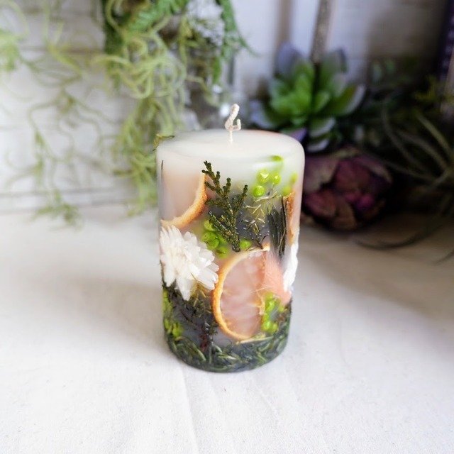 ひと手間かけて3D加工を施しています。 フレッシュな酸味とやさしい甘さが調和した「オレンジ」の香り。 明るく前向きな気分を引き出し、リフレッシュしたいときにそっと寄り添います。 ********** オレンジの花言葉は『純粋』『愛らしさ』『花嫁の喜び』など。 ********** 燃焼部分にソイワックスを使用しています。 ソイワックスはススや消した後の嫌な匂いも少なく、空気清浄効果があるといわれています。低温でゆっくり溶けるのでふんわりアロマが広がります。また、パラフィン製とはひと味違う優しい灯りもポイントです。 ※注意※ ・外側は燃焼しづらい加工をしてありますが、万が一ドライフラワーなどが溶けだしてきたら一旦火を消して割りばしなどで取り除いてください。 ・3D加工のため、使用している花材によっては触るとチクチクする場合がありますのでご注意ください。 ・ 他サイトでも在庫を共有しているため、入れ違いで完売となる場合があります。先にご入金頂いた方優先となりますのでご了承ください。 ・名入れ等をご希望の場合はキャンドルと一緒に別ページにある「3D用メッセージキャンドル」をカートに入れてください。 2800円 ・Sサイズ:直径 約6cm、高さ 約9cm ・燃焼時間:約40時間(使用環境により異なります) ・使用花材:オレンジ、ヘリクリサム、ペッパーベリー等