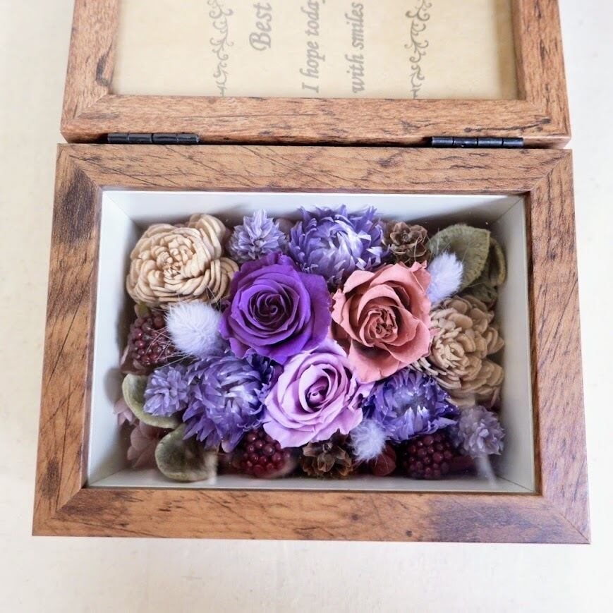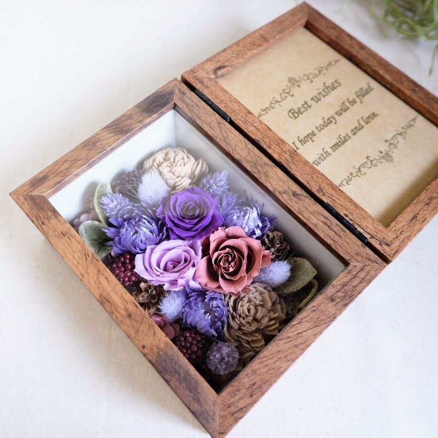 ガラスカバー付きなのでお花にホコリがつく心配がなく、長くきれいな状態でお楽しみいただけます。縦置き・横置きのどちらにも対応しているため、置く場所や入れる写真を選ばず、インテリアに合わせてお使いいただけます。