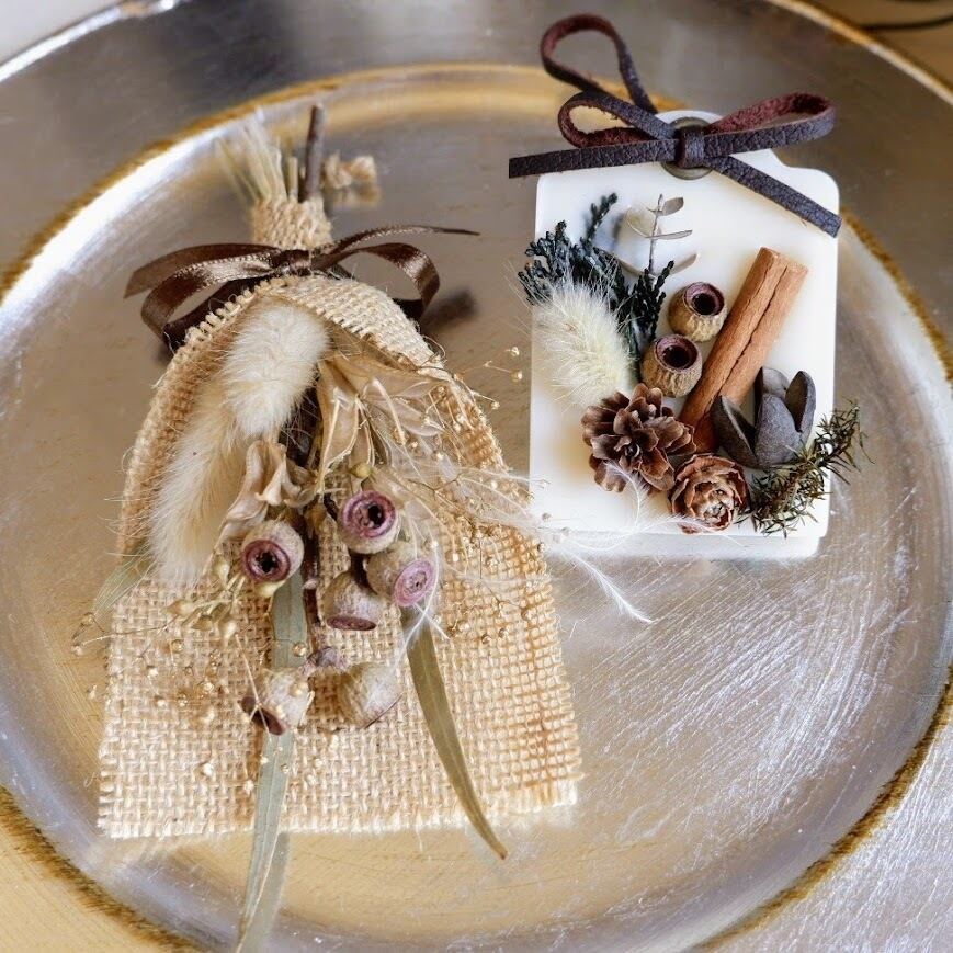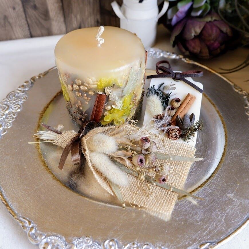 ひと手間かけて3D加工を施したボタニカルキャンドルWサイズ、アロマワックスサシェ、ミニスワッグの3点セットです。ボックスに入れてお届けします。