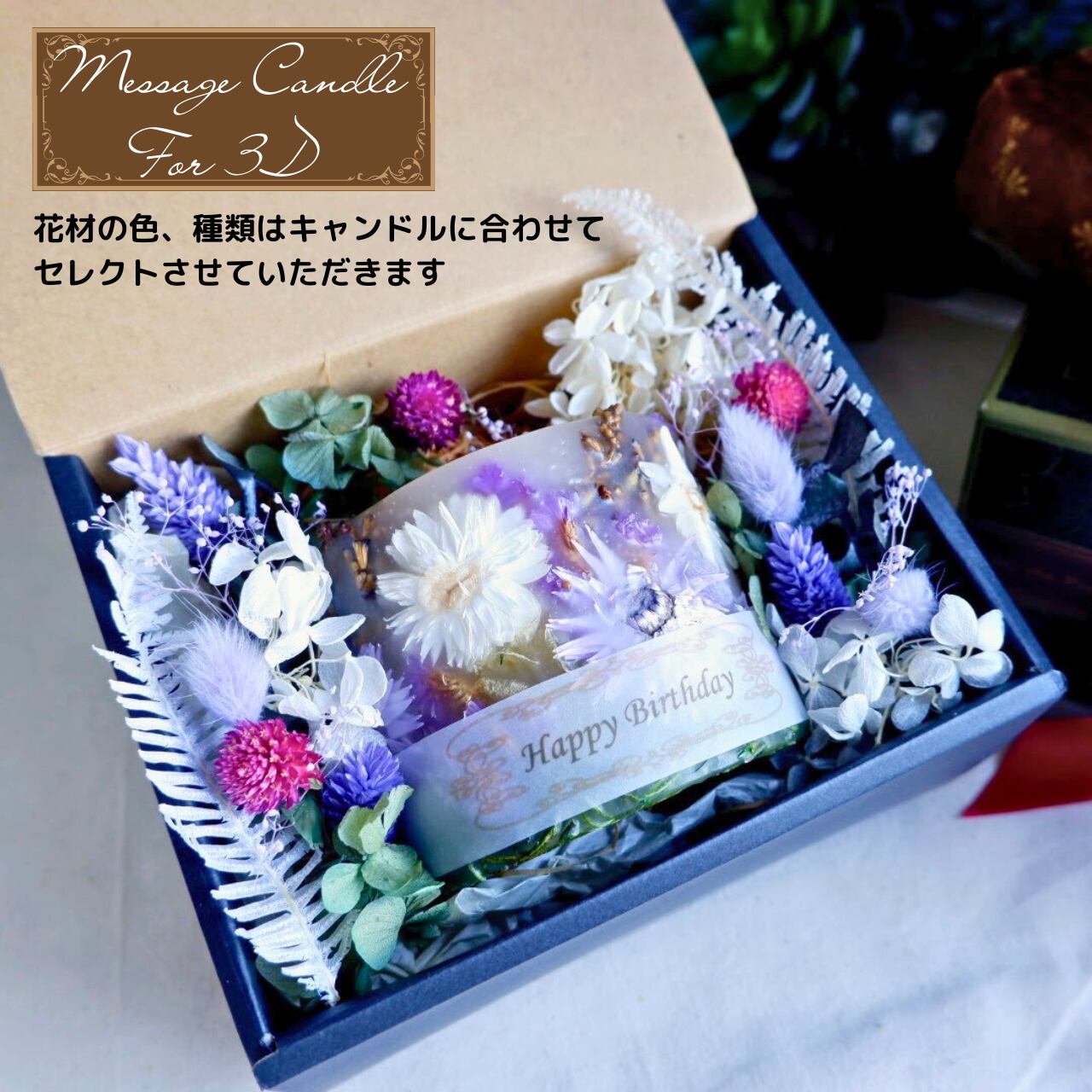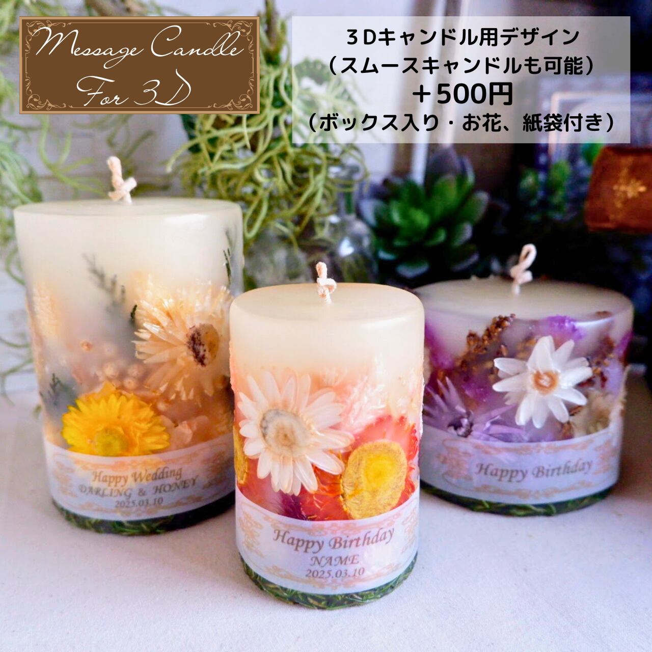 ・名入れ等をご希望の場合はキャンドルと一緒に別ページにある「メッセージキャンドル3D用」をカートに入れてください。