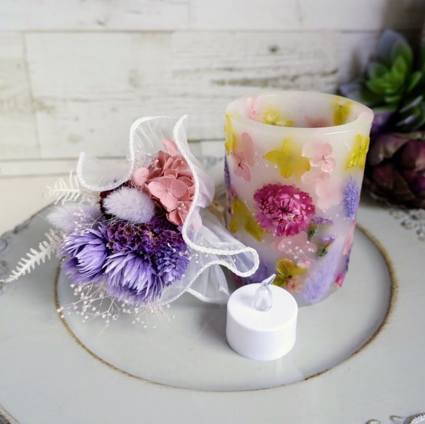 ボタニカルキャンドルとLEDライト専用キャンドルホルダー、ミニブーケを合わせた「灯りと花」を楽しめるギフトセットです。