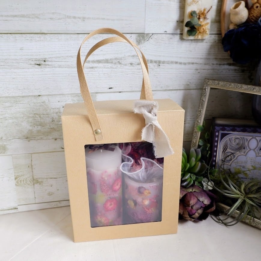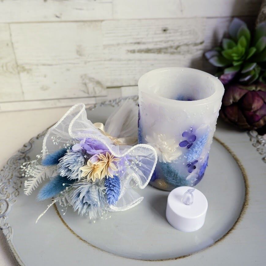 ボタニカルキャンドルとLEDライト専用キャンドルホルダー、ミニブーケを合わせた「灯りと花」を楽しめるギフトセットです。
