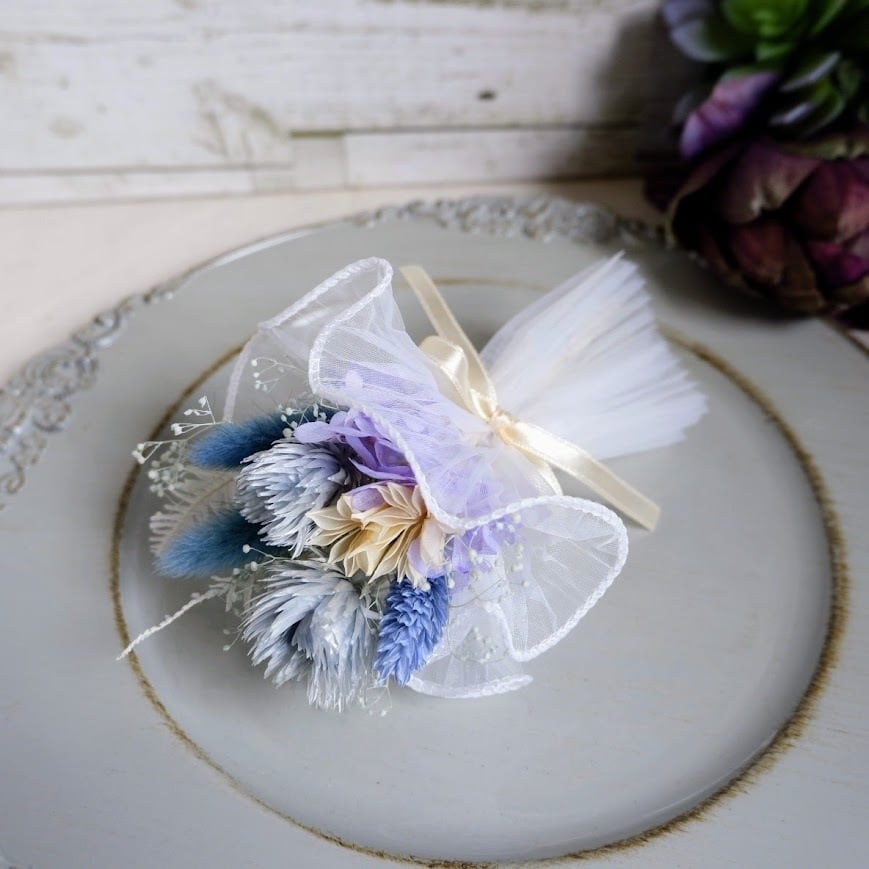 ドライフラワーやプリザーブドフラワーを使用しています。経年により退色などの変化がありますが、変わりゆくさまもお楽しみください。