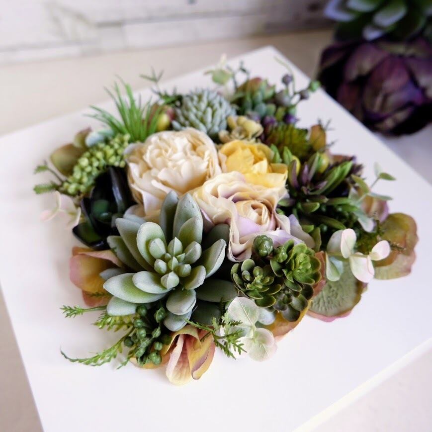 立体感のある多肉とお花をバランスよく配置し、フレームの中に小さな景色を閉じ込めました。