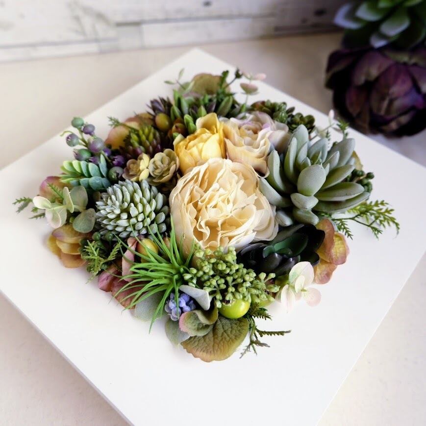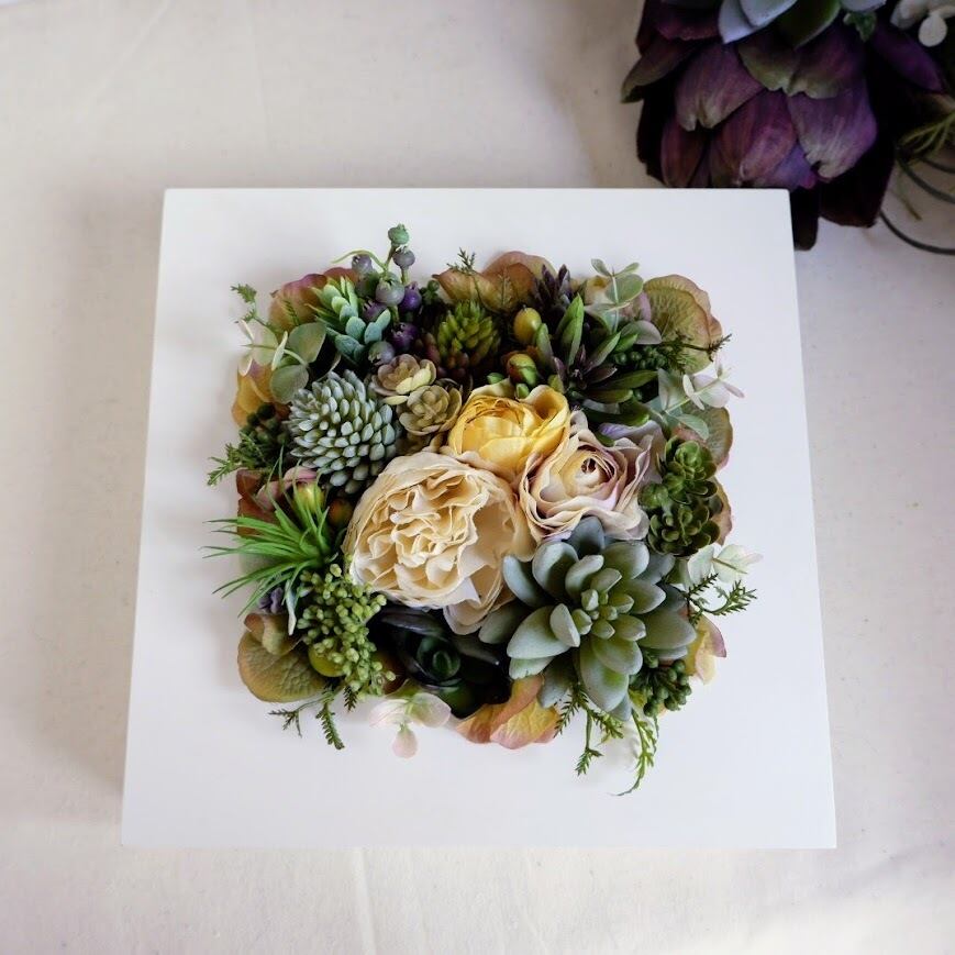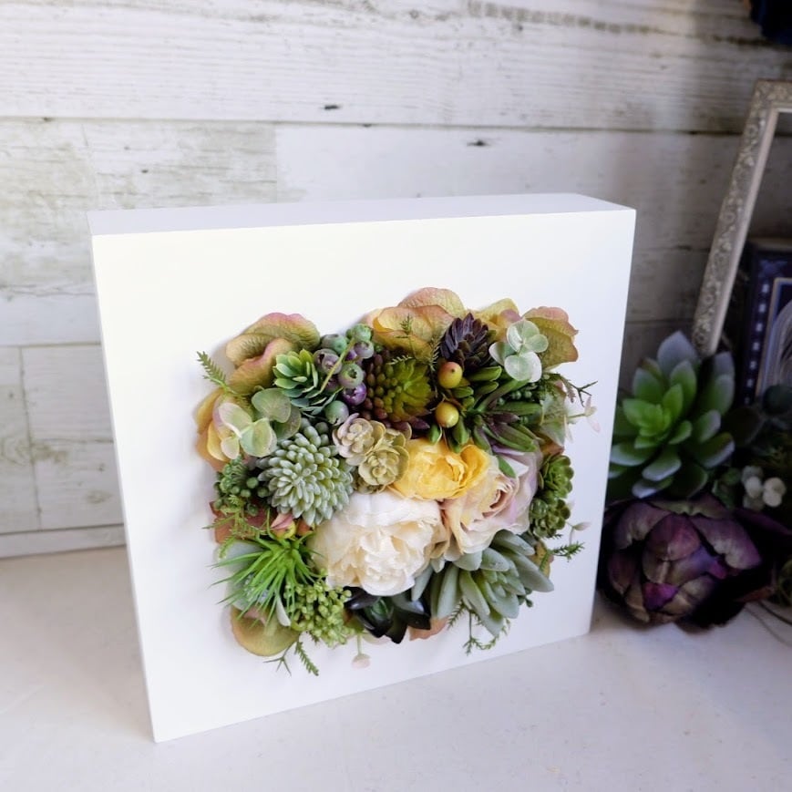 高品質な造花(アーティフィシャルフラワー・グリーン)を使用し、多肉植物の表情を生かして仕上げたフレームアレンジメントです。