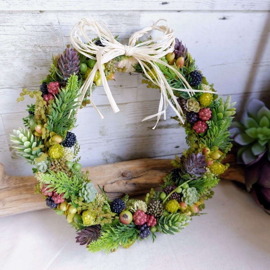 アーティフィシャルフラワー(造花)のグリーンや多肉植物、ベリーのパーツを使用したリースです。