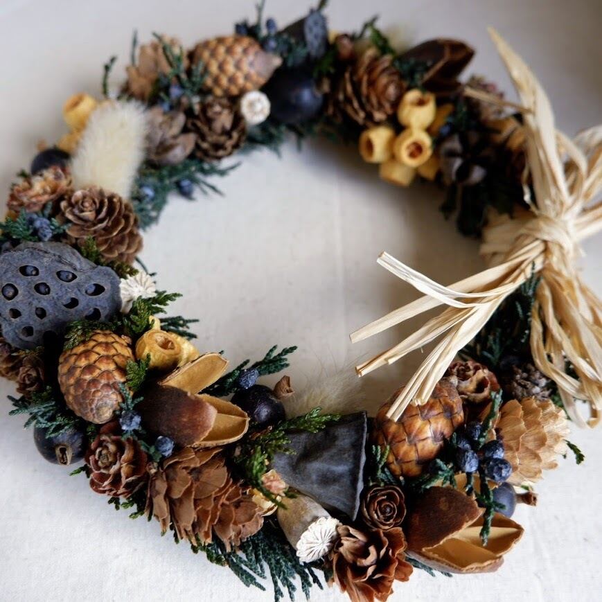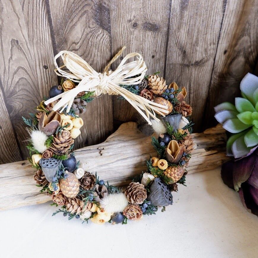実物やドライフラワー、プリザーブドフラワーを束ねた、通年で楽しめる小ぶりなリースです。
