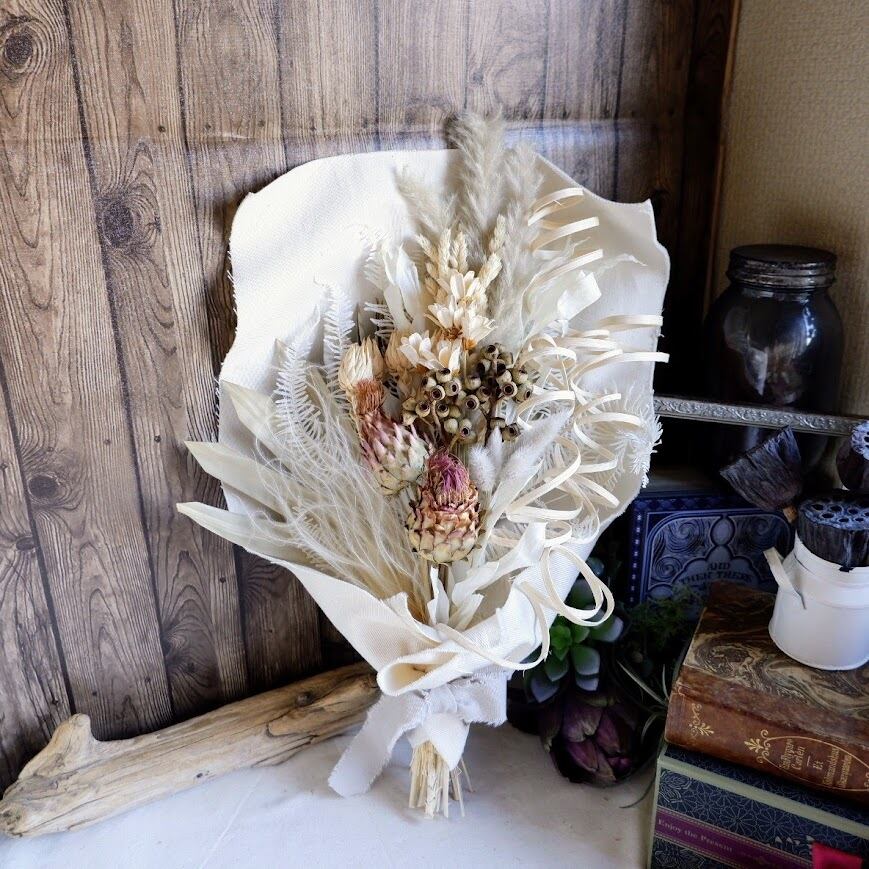 実物やドライフラワー、プリザーブドフラワーを贅沢に束ねた、ボリュームたっぷりのLサイズスワッグです。