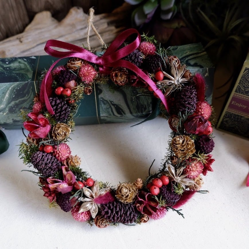 実物やドライフラワー、プリザーブドフラワーを使った、秋冬らしいあたたかみのあるデザインのSサイズリースです。