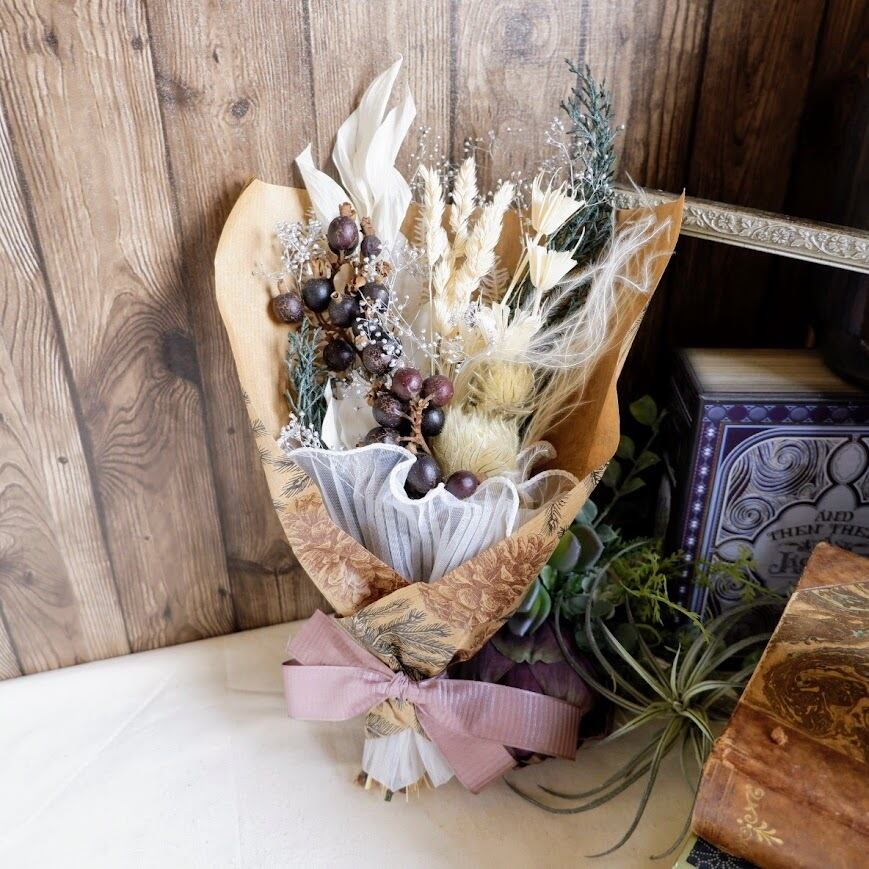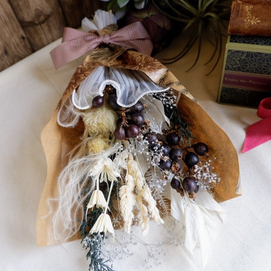 ドライフラワーやプリザーブドフラワーを使用しているため、少しずつ色合いや風合いが変化していきます。その移ろいもあわせて、長くお楽しみください。