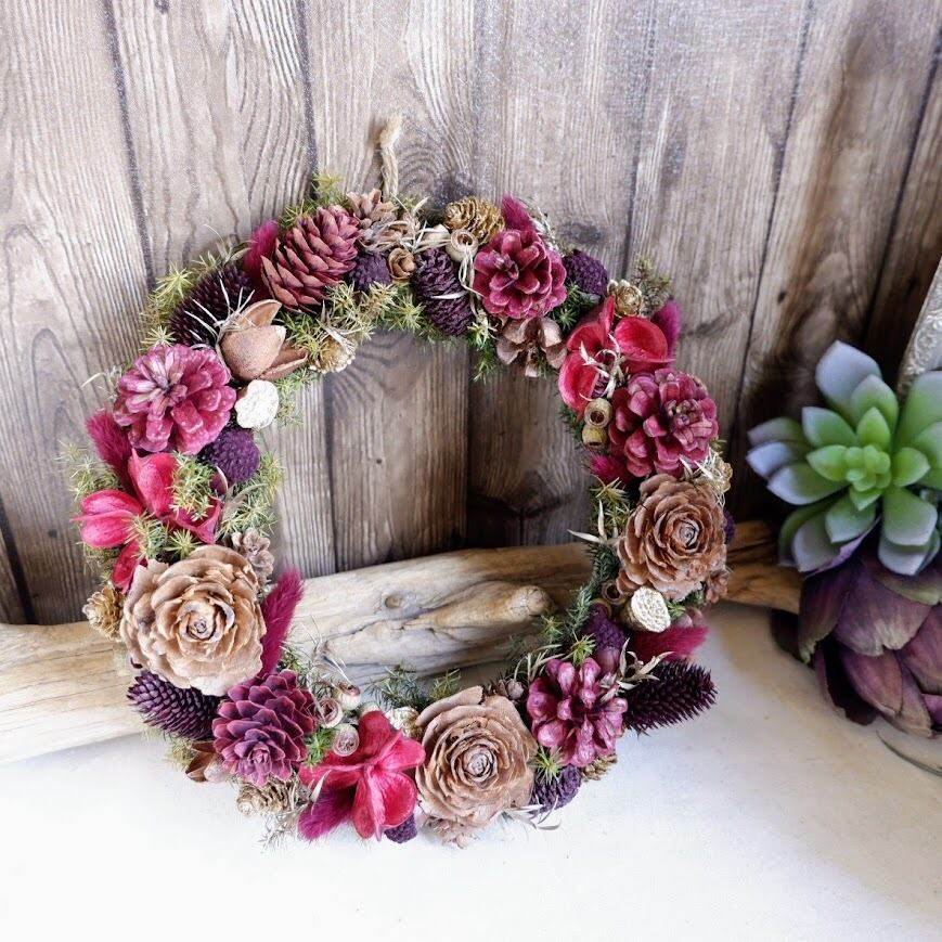 実物やドライフラワー、プリザーブドフラワーをバランスよく束ねた、秋冬シーズンにぴったりのリースです。