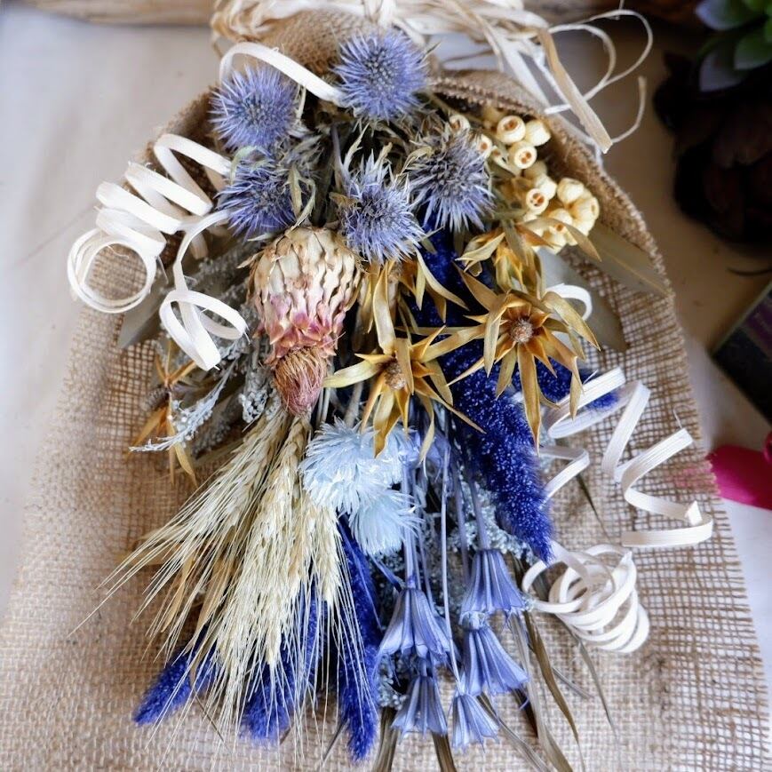 ・使用花材:アーティチョーク、セタリア、ルリタマアザミ、麦等