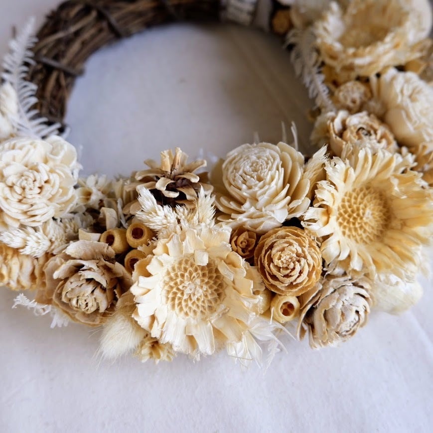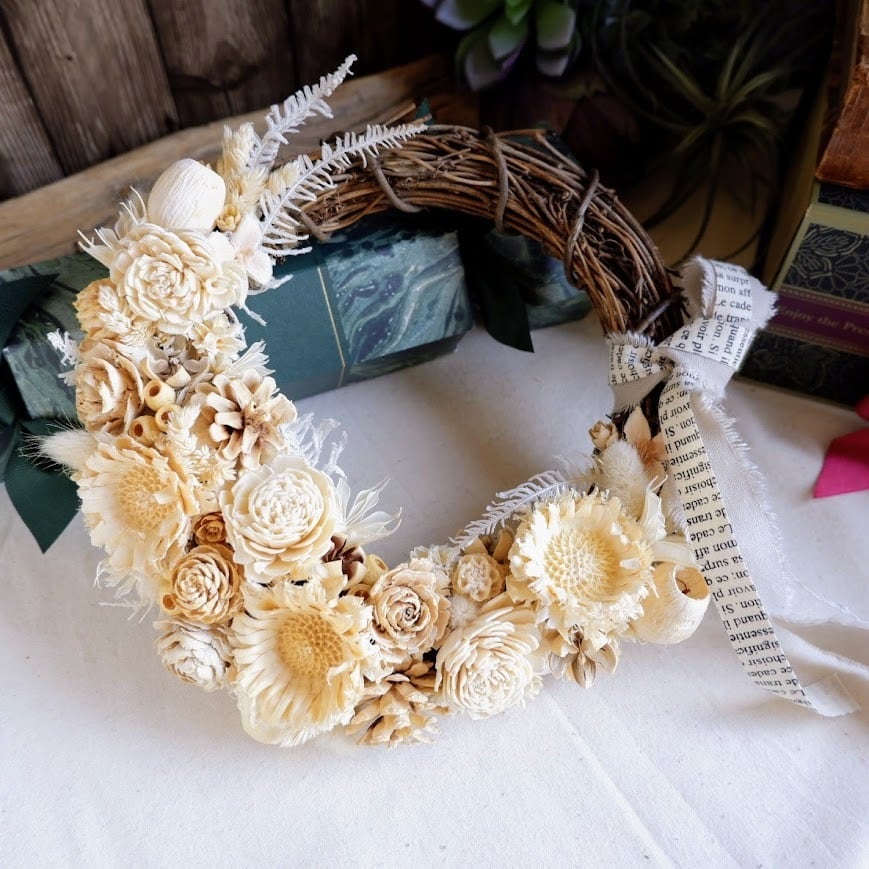 実物やドライフラワー、プリザーブドフラワーをバランスよく束ねた、通年で楽しめるリースです。