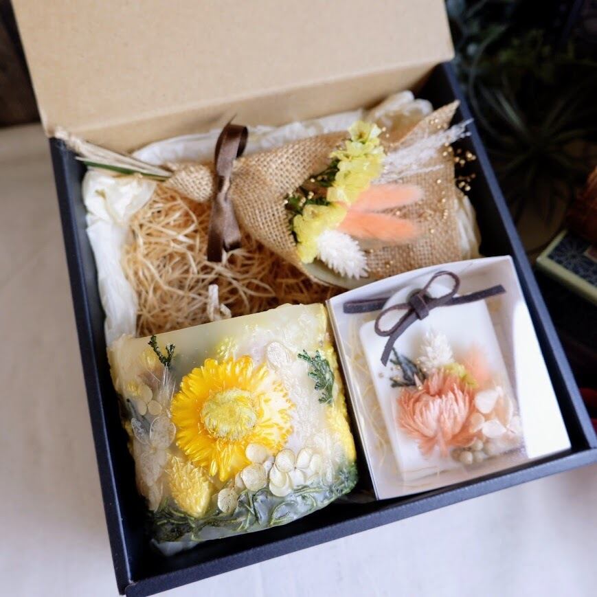 ひと手間かけて3D加工を施したボタニカルキャンドルWサイズ、アロマワックスサシェ、ミニスワッグの3点セットです。ボックスに入れてお届けします。